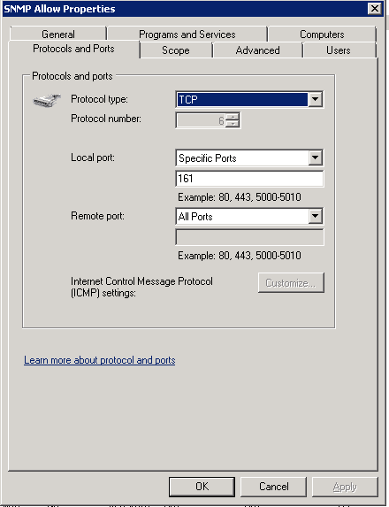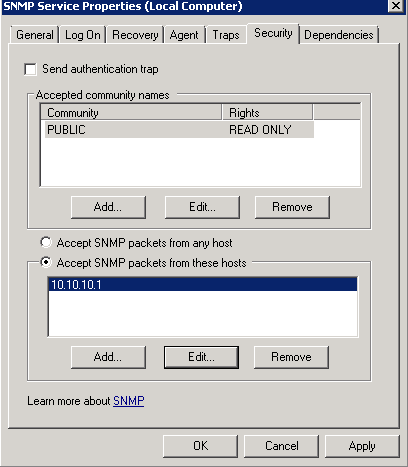 Make sure you have SNMP installed and configured. Â After installing the appropriate components in Windows you have to go in and edit the Security and Trap properties: