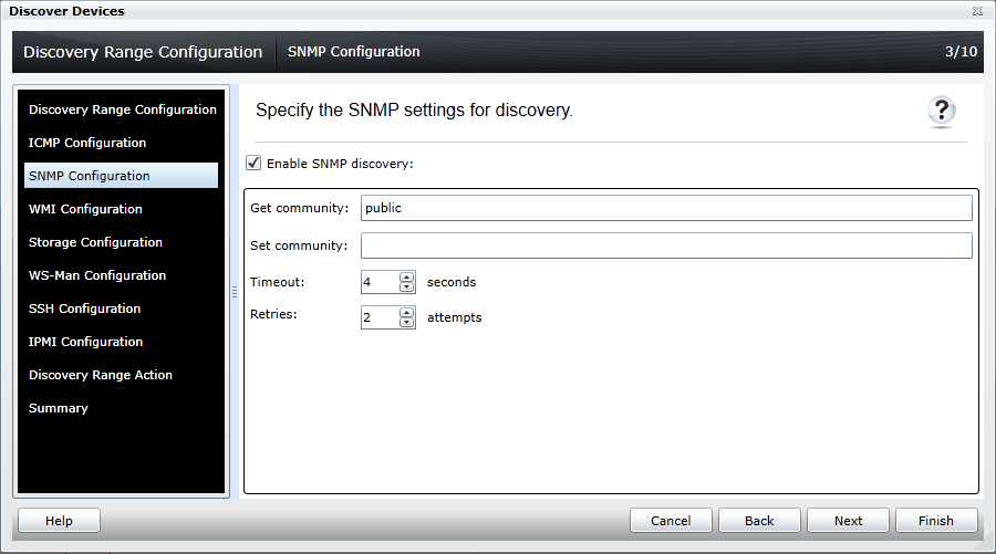 Also, in OME itself, one mistake I made a couple of times in the outset when setting up a discovery range is that I simply hit “Finish” and not Next on the dialog box as it will allow you to do either. Â So you may accidentally go past the SNMP configuration section setting up the discovery range. Â Make sure you configure this part to properly discover your server:
