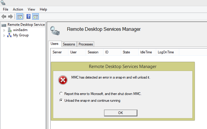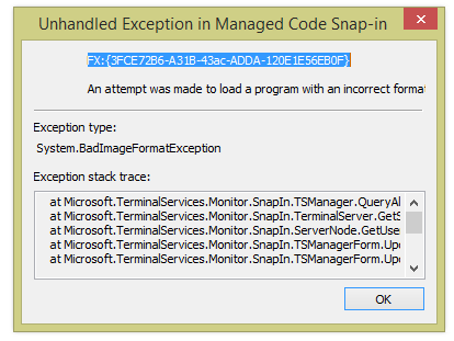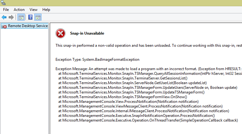 Upon launching the snapin via the TSADMIN.MSC command, I received the following:
