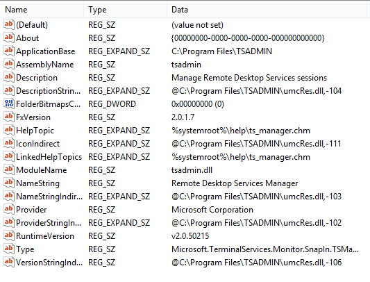 Windows Registry Editor Version 5.00 [HKEY_LOCAL_MACHINESOFTWAREMicrosoftMMCSnapInsFX:{3FCE72B6-A31B-43ac-ADDA-120E1E56EB0F}] "ApplicationBase"=hex(2):43,00,3a,00,5c,00,57,00,69,00,6e,00,64,00,6f,00,77,00, 73,00,5c,00,53,00,79,00,73,00,74,00,65,00,6d,00,33,00,32,00,00,00 "About"="{00000000-0000-0000-0000-000000000000}" "VersionStringIndirect"="@C:\Windows\System32\umcRes.dll,-106" "ProviderStringIndirect"=hex(2):40,00,43,00,3a,00,5c,00,57,00,69,00,6e,00,64, 00,6f,00,77,00,73,00,5c,00,53,00,79,00,73,00,74,00,65,00,6d,00,33,00,32,00, 5c,00,75,00,6d,00,63,00,52,00,65,00,73,00,2e,00,64,00,6c,00,6c,00,2c,00,2d, 00,31,00,30,00,32,00,00,00 "NameString"="Remote Desktop Services Manager" "HelpTopic"=hex(2):25,00,73,00,79,00,73,00,74,00,65,00,6d,00,72,00,6f,00,6f,00, 74,00,25,00,5c,00,68,00,65,00,6c,00,70,00,5c,00,74,00,73,00,5f,00,6d,00,61, 00,6e,00,61,00,67,00,65,00,72,00,2e,00,63,00,68,00,6d,00,00,00 "AssemblyName"="tsadmin" "RuntimeVersion"="v2.0.50215" "Description"="Manage Remote Desktop Services sessions" "DescriptionStringIndirect"=hex(2):40,00,43,00,3a,00,5c,00,57,00,69,00,6e,00, 64,00,6f,00,77,00,73,00,5c,00,53,00,79,00,73,00,74,00,65,00,6d,00,33,00,32, 00,5c,00,75,00,6d,00,63,00,52,00,65,00,73,00,2e,00,64,00,6c,00,6c,00,2c,00, 2d,00,31,00,30,00,34,00,00,00 "LinkedHelpTopics"=hex(2):25,00,73,00,79,00,73,00,74,00,65,00,6d,00,72,00,6f, 00,6f,00,74,00,25,00,5c,00,68,00,65,00,6c,00,70,00,5c,00,74,00,73,00,5f,00, 6d,00,61,00,6e,00,61,00,67,00,65,00,72,00,2e,00,63,00,68,00,6d,00,00,00 "NameStringIndirect"=hex(2):40,00,43,00,3a,00,5c,00,57,00,69,00,6e,00,64,00,6f, 00,77,00,73,00,5c,00,53,00,79,00,73,00,74,00,65,00,6d,00,33,00,32,00,5c,00, 75,00,6d,00,63,00,52,00,65,00,73,00,2e,00,64,00,6c,00,6c,00,2c,00,2d,00,31, 00,30,00,33,00,00,00 "IconIndirect"=hex(2):40,00,43,00,3a,00,5c,00,57,00,69,00,6e,00,64,00,6f,00,77, 00,73,00,5c,00,53,00,79,00,73,00,74,00,65,00,6d,00,33,00,32,00,5c,00,75,00, 6d,00,63,00,52,00,65,00,73,00,2e,00,64,00,6c,00,6c,00,2c,00,2d,00,31,00,31, 00,31,00,00,00 "FxVersion"="2.0.1.7" "Type"="Microsoft.TerminalServices.Monitor.SnapIn.TSManagerSnapIn, tsadmin, Version=6.1.0.0, Culture=neutral, PublicKeyToken=31bf3856ad364e35" "FolderBitmapsColorMask"=dword:00000000 "ModuleName"="tsadmin.dll" "Provider"="Microsoft Corporation" [HKEY_LOCAL_MACHINESOFTWAREMicrosoftMMCSnapInsFX:{3FCE72B6-A31B-43ac-ADDA-120E1E56EB0F}NodeTypes] [HKEY_LOCAL_MACHINESOFTWAREMicrosoftMMCSnapInsFX:{3FCE72B6-A31B-43ac-ADDA-120E1E56EB0F}Standalone]