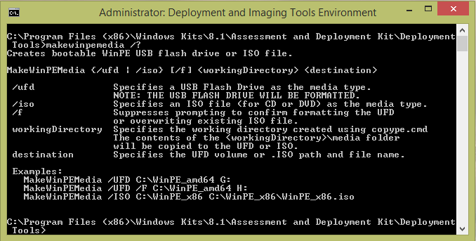 In working with Windows 8.1ย WADK in a client environment recently, the need arose to create a USB key to boot from for PE environment on a workstation. ย There is a new command in the WADK Deployment and Imaging Tools environment that allows one to easily create a bootable USB key to use to initialize the PE environment –ย makewinpemedia