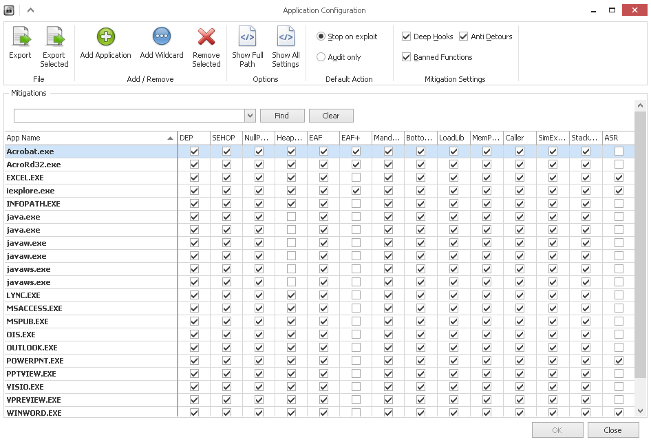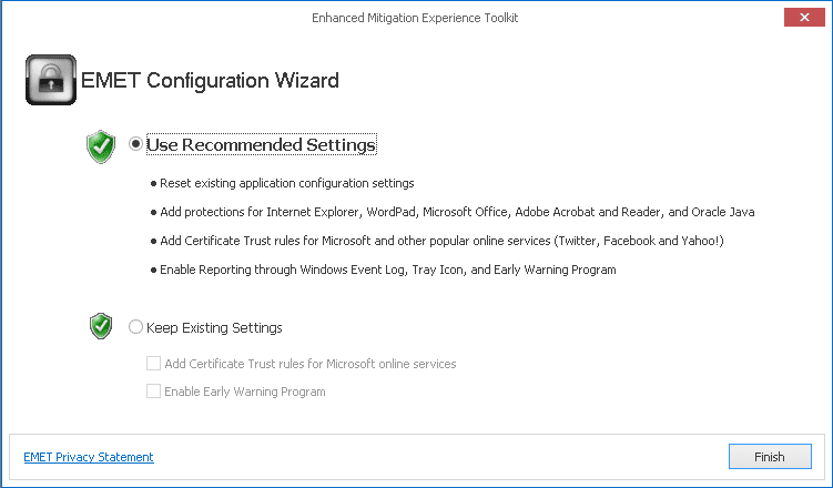 - The default recommended settings includes protection for Internet Explorer, Wordpad, Microsoft Office, Adobe Acrobat and Reader, and Oracle Java. Â It also adds default EAF+ rules and Certificate trust rules.