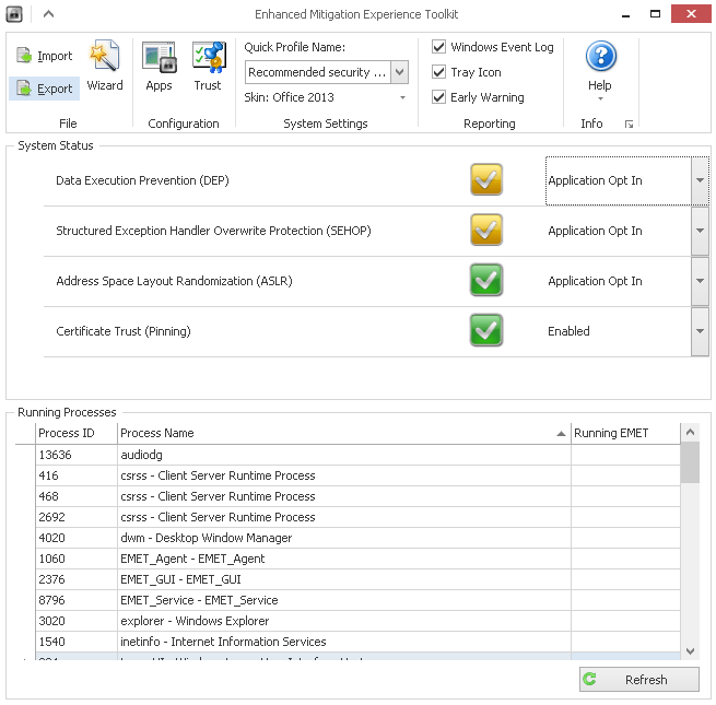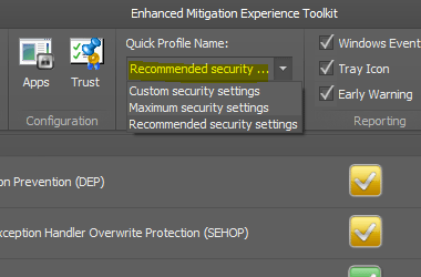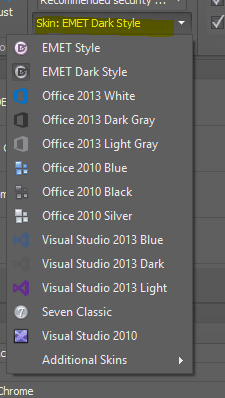 I really like the fact that the EMET software is very customizable in the way it operates as well as its look and feel. Â The software comes preinstalled with many different themes to changes things up. Â Also, you can customize the security level of the rules being applied with a simple dropdown box to up the security from the recommended settings to the maximum security levels the software provides.
