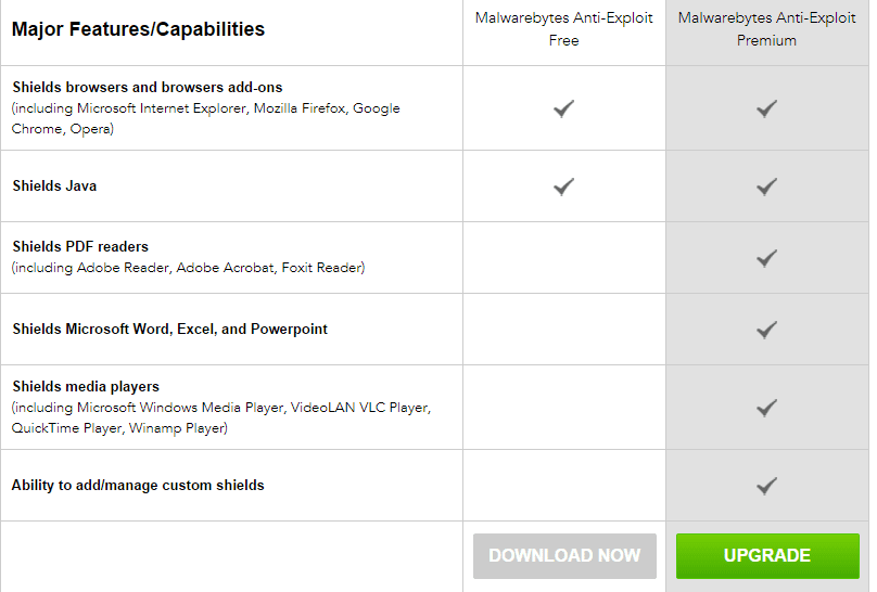 One nice thing about the EMET 5.0 product is that it includes these other modules for free. Â Unlike products such as the Malwarebytes AntiExploit product, you can mitigate any process you want via the EMET product. Â With Malwarebytes, to get such protection as PDF viewers you have to upgrade to the pay version as seen below from the Malwarebytes feature comparison.