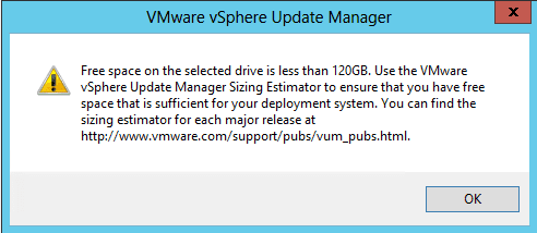 - If you point Update manager to a drive to use in storing updates and patches that has less than 120GB, it will complain with the error below: