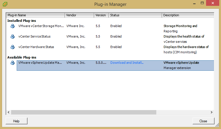 - After the server component completes, when you launch the vSphere Client and look under the Plug-in Manager, you should see the new option for “VMware vSphere Update Manager” with the Status of “Download and Install” available. ย When you click the option you will see the Windows Installer Wizard for Update manager kick off.