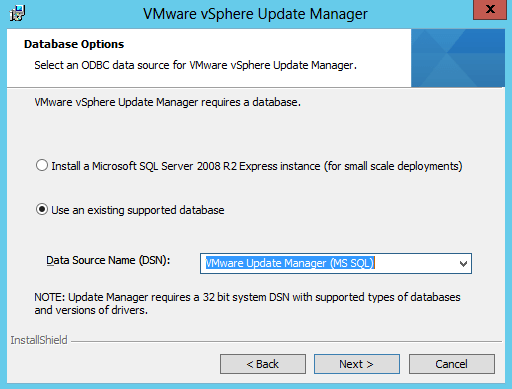 - Here you can either choose to install the SQL Server 2008 R2 Express edition or point to an existing instance of SQL server to install the Database component of Update Manager.