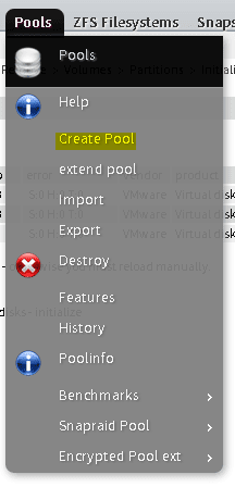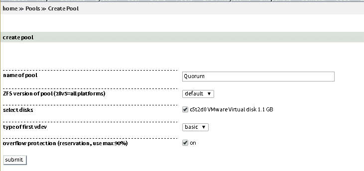 - After you have added the storage physically (hard disks, or vmdk files) you will want to go to Pools >> create Pool to start provisioning your storage.