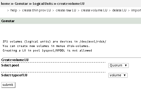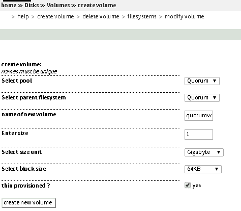 - Select the pool, parent filesystem, and name of the volume along with the size