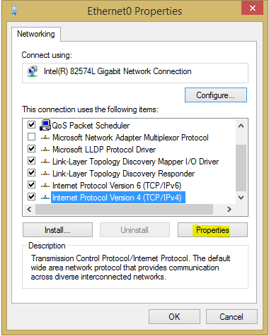 Get to the network connection properties which can easily be done by typing ncpa.cpl at a run or search menu. Click Properties