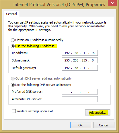 For this to work, you must have a static IP address set and not be getting an IP address from DHCP. Set your first static IP address and then select Advanced.