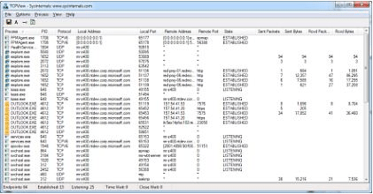 TCPView is a Windows SysInternals Tool that is designed to basically showย detailed listings of all TCP and UDP endpoints on your system, including the local and remote addresses and state of TCP connections. ย The download of the utility also includes a commandline version of the tool inย tcpvcon. ย Download TCPView here: ย https://technet.microsoft.com/en-us/sysinternals/bb897437.aspx