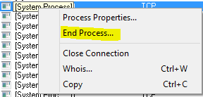 Another really nice feature of TCPView is that you can right-click on any connection entry and then Kill the process that is using it: