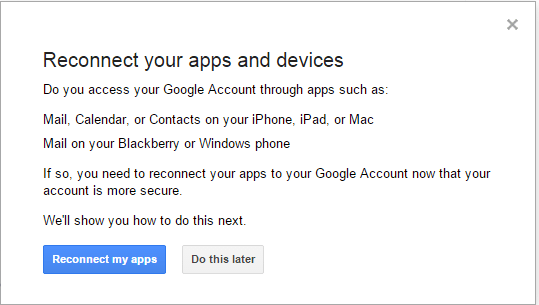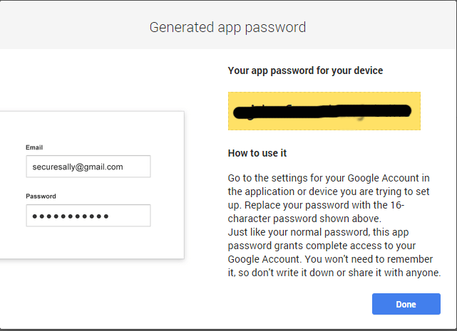 You will get a screen that shows your 16 digit app specific password. ย Enter this password in your App that you are reconnecting. ย For instance your Gmail app.