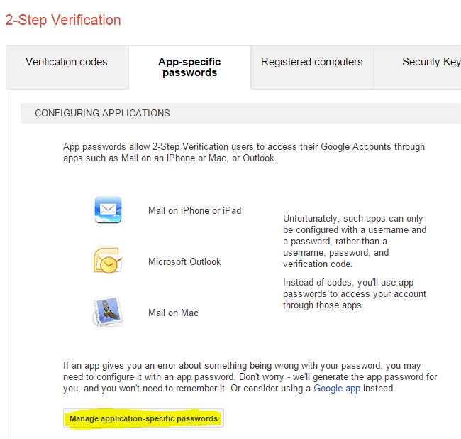The second order of business will be revisiting the app specific passwords. ย As we mentioned above, your mobile apps such as your Gmail app are broken at this point. ย Using the App-specific tab, you can create an app-specific password that verifies your specific app on your phone. ย Click theย Manage application specific passwordsย at the bottom of the App-specific passwords tab.