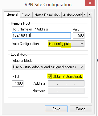 - Make sure under theย auto configurationย section to selectย ike config pull and then under theย Adapter Modeย to selectย obtain automatically