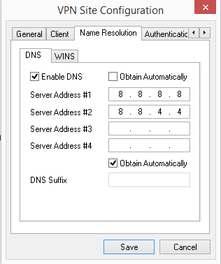 Under name resolution in my particular config, I setup public DNS resolvers, however, these can be set to any that you wish, or selected toย Obtain Automatically which should pull from your Sophos VPN addresses DNS configuration.