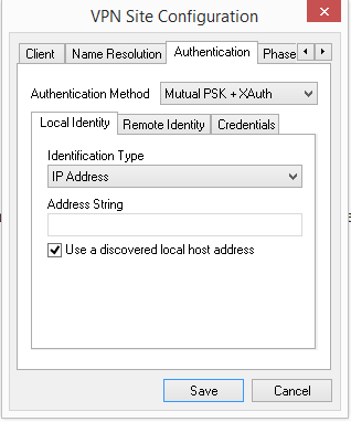 Since I am using a preshared key and XAUTH, I have selected that below under theย Authenticationย tab. ย Also, leave the Identification type under Local Identity as the default IP Address.