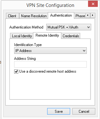 Still in the Authentication tab, leave the defaultย Identification Typeย for Remote Identity selected as IP Address.