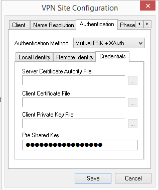 Under theย Credentialsย tab you will need to specify yourย Pre Shared Key