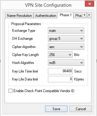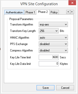 The settings below were matched up to the AES 256 policy I am using for the Policy type on the VPN connection on Phase 1.
