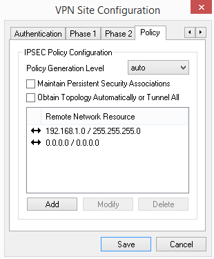 After you finish the Policy tab, you should be ready to go to test the VPN connection. ย Save the connection above and then double click it and you should see a screen similar to the below where you will be asked for your XAUTH username and password that you specified on the Sophos UTM side.