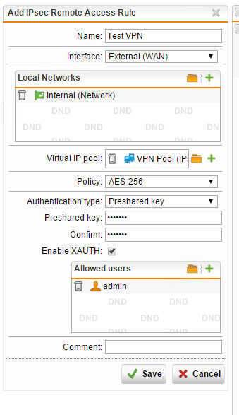 The user is specified underneath theย Allowed usersย box that appears after you select Enable XAUTH. ย Once you setup the user, simply hitย Save.