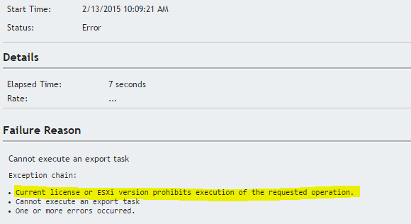 The exact error message is:ย Current license or ESXi version prohibits execution of the requested operation. ย The explanation to the error is found in this Dell AppAssure KB article: ย https://support.software.dell.com/appassure/kb/117585ย where Dell explains that certain APIs that are needed for virtual exportsย to work are not available in the free version of the product. ย The minimum ESXi edition that is supported within AppAssure is VMware vSphere Essentials version 4 or for version 5 Standard