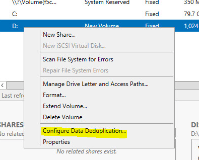 After you install the deduplication role service, go to Server Manager >> File and Storage Services and then click on Volumes.  Right click on the volume you want to configure data deduplication on, which in our case in the D: drive.  Click Configure Data Deduplication.