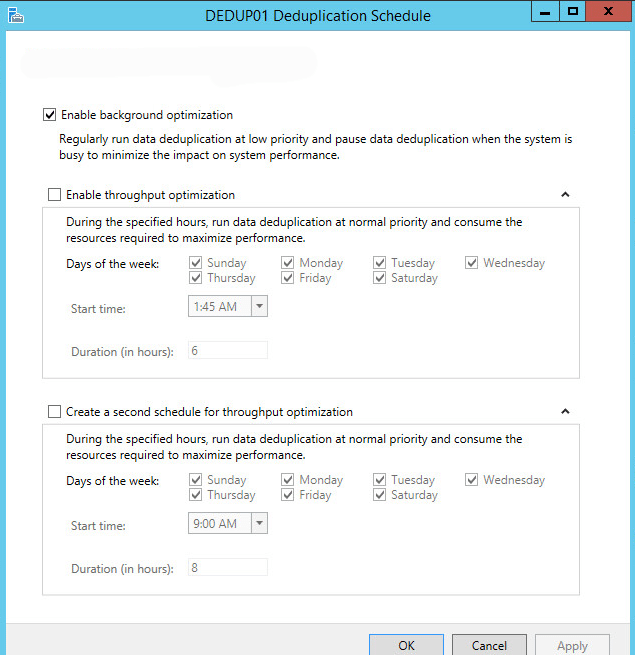 You will be presented with the configuration settings page for deduplication, where you can select the type of deduplication purpose which here we have opted for the General purpose file server.  Also, you can setup the schedule of deduplication which by default is a background process that runs.