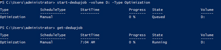 start-dedupjob -volume D: -Type Optimization get-dedupjob