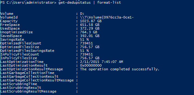 Also, the command get-dedupstatus is very valuable to get an overview of deduplication status from powershell.