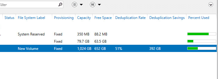 Having been running Windows Server 2012 R2 in many environments for quite some time now, I still as of yet haven’t had a real world test of data deduplication to see how the storage savings would be shown after turning on dedup on a file server. Â The opportunity presented itself recently with a client that had a file server with roughly 800GB of files stored on a 1TB volume. Â This file server was your normal run of the mill file server housing many documents, other files and folders for general departmental access.
