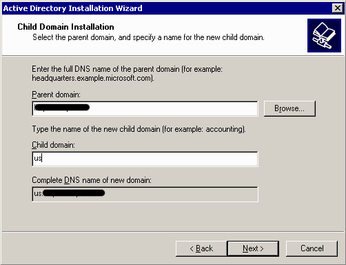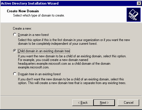 Here you see the domain creation options. Â As mentioned above, the upgraded NT4 domain in our environment will be joined as a child domain to the parent AD domain already in existence.