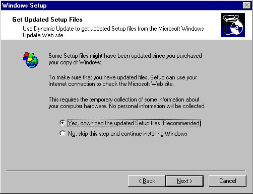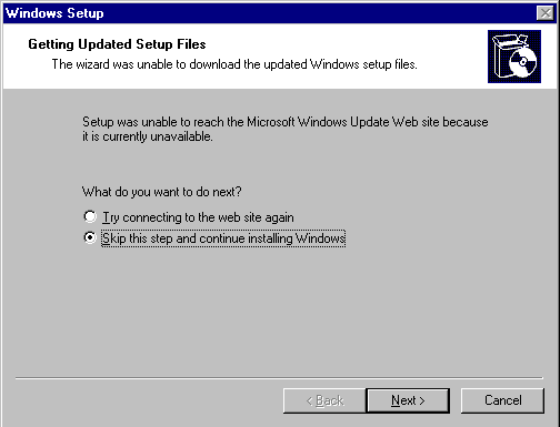 I found in the VM lab test environment the above download of updated setup files failed. Â So I simply chose to skip this step. Â Who knows if the URLs it is trying even exist anymore?