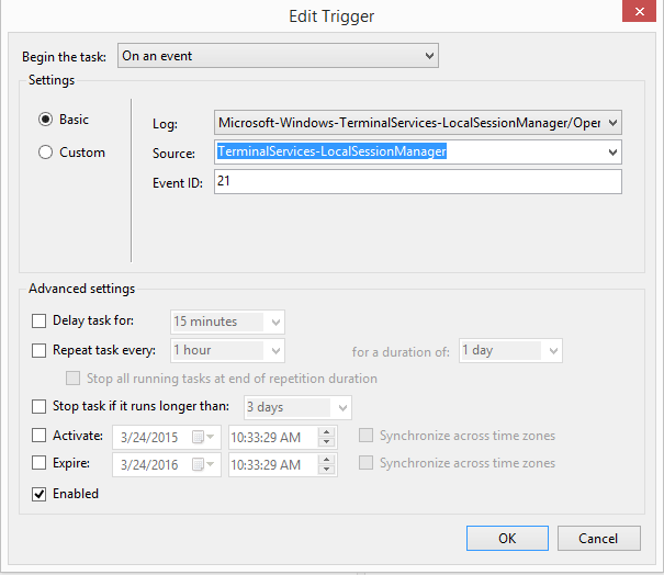 Now that we have the hard part of getting the files in place that we need, we simply need to create some scheduled tasks that fire an action when an event is logged for users logging in or reconnecting a session.
