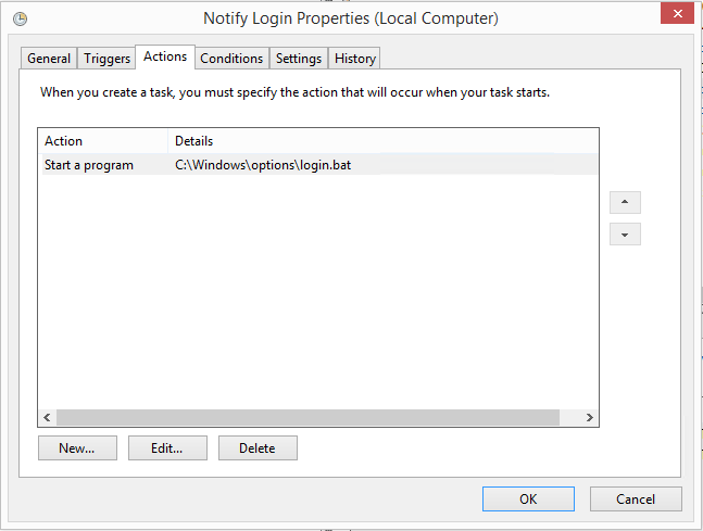 In the screenshots above, we have setup a scheduled task that begins the task “on an event” and we are going to watch the Log located at Microsoft-Windows-TerminalServices-LocalSessionManager/Operational and look for Event ID: 21 and 25. The Actions tab contains the location of our login.bat file we have the contents of above. Here it is located under c:windowsoptions.