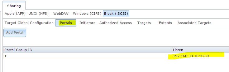 After you have confirmed your IP address, the next thing we need to do is reconfigure our iSCSI parameters for the new IP Address and the section we need to adjust is theย Portal section of the iSCSI configuration screen. ย This takes place in the Web GUI of the FreeNAS appliance. ย Simply login there and navigate to the iSCSI configuration screen.