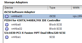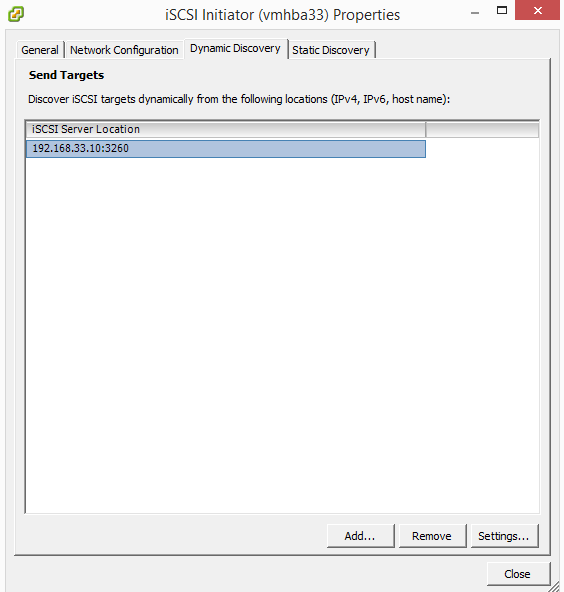 - Go to yourย Storage Adapters and then click the properties of your iSCSI Initiator adapter >> go toย Dynamic Discovery tab and remove the old ip address entry and then add the correct IP address for the iSCSI target now that you have changed the ip address.