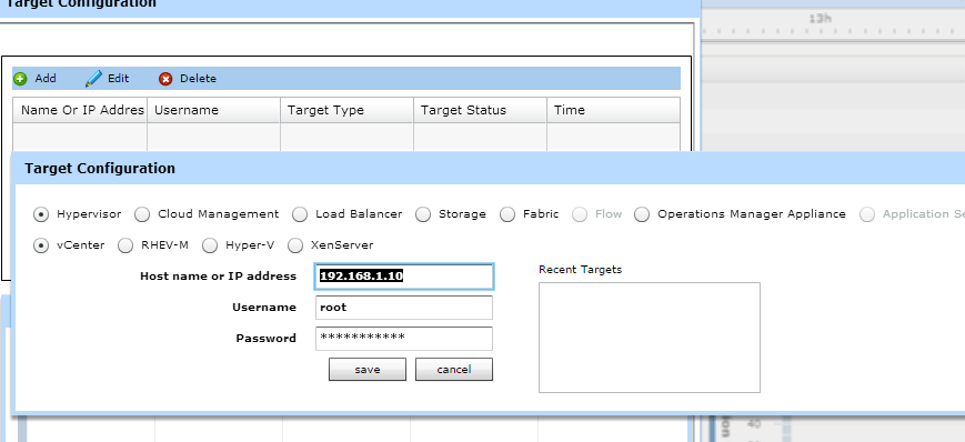Next, we have the Target Configuration which allows you to enter the connection information for your vCenter environment.