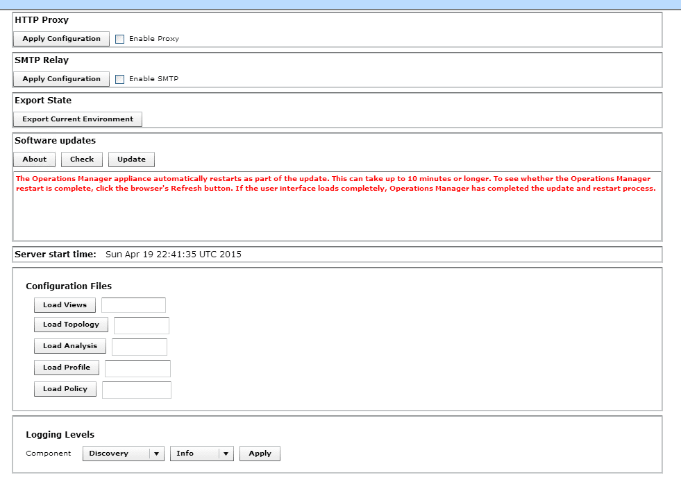 After you clickย Yes you will see the note “The Operations Manager appliance automatically restarts as part of the update. ย This can take up to 10 minutes or longer. ย To see whether the Operations Manager restart is complete, click the browser’s Refresh button. ย If the user interface loads completely, Operations Manager has completed the update and restart process”.