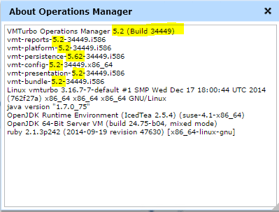 After you have refreshed your browser and are able to log back in. ย Click the gear icon over in the upper right hand corner and clickย About. ย You should see that your VMTurbo appliance is now at the 5.2 version level.