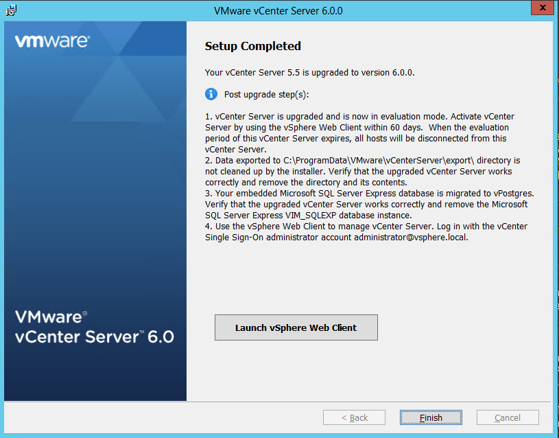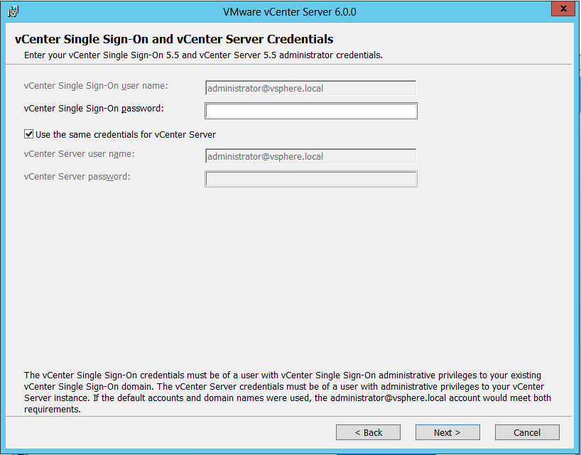 With the release of VCSA 6.0 virtual appliance, many admins are looking to migrate over to the appliance instead of continuing to use the Windows based installation. Â However, if you are sticking with Windows vCenter Server for the time being, the upgrade to 6.0 is VERY simple and painless as you can see from the screenshots above.