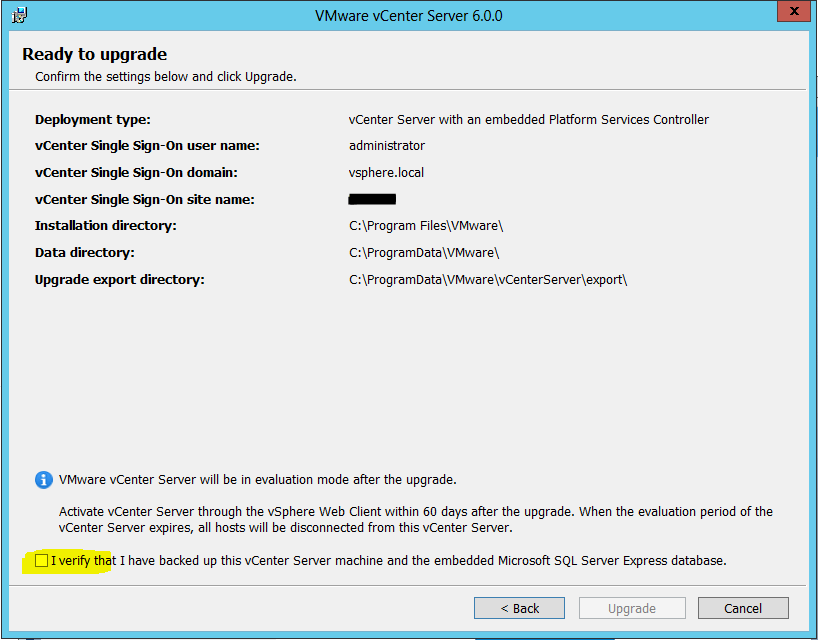 What I did was take a snapshot of my vCenter server so I had a rollback point in case something did go wrong along the way. Â This way you are covered and have a backup that is easily restored to get you back to a working state. Â However, even though I had the backup, fortunately I did not have to roll back to it and was able to safely delete after verifying everything had been upgraded successfully and was working.