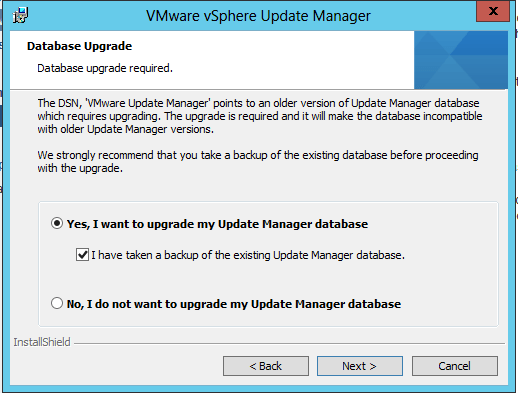 Again, the warning about backups needing to be in place and you have to agree that you have already backed up your Update Manager database.