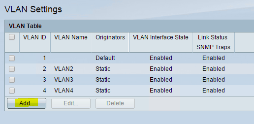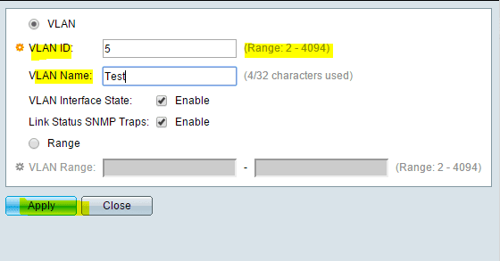 Click to Add a VLAN with the VLAN ID and name. Note below you can also add a range of VLANs by specifying the range in the VLAN ID field.