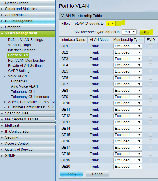 - switchport trunk allowed vlan add 5 (this will add VLAN 5 to ports 1-20)