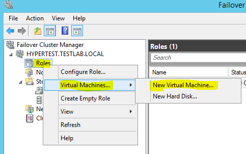 Once you have the above items completed, you should be able to click on the Roles underneath your cluster name and add a virtual machine.  At this point you have successfully built a Hyper-V cluster inside of VMware Workstation.