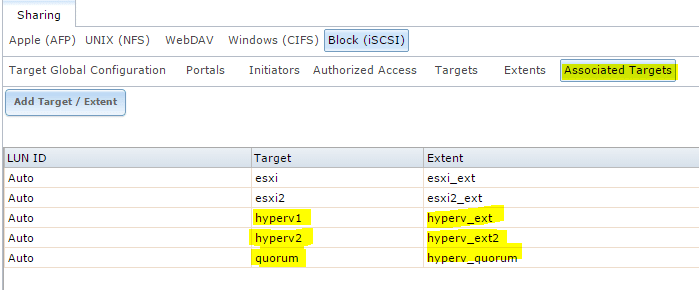 Below are screenshots taken from the iSCSI setup on my FreeNAS VM.  You see the Targets, Extents, and Associated Targets.