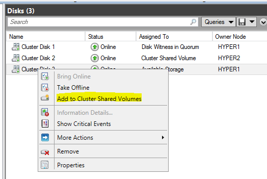 The below screenshots are taken from the Failover Cluster Manager.  Click on your shared storage and click to Add to Cluster Shared Volumes